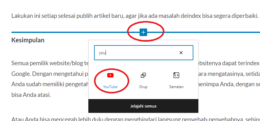 Jika akan menyisipkan ke dalam postingan yang sudah publish, Anda bisa menyisipkannya dengan cara klik tanda plus pada blok Gutenberg. Cari You Tube pada jenis blok, kemudian paste link embed video