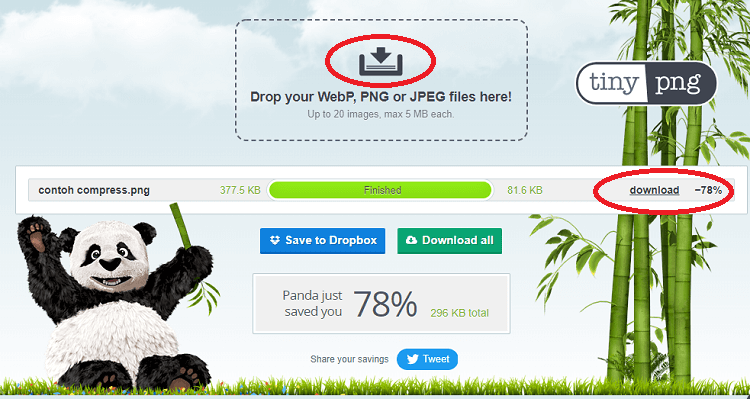 TinyPNG adalah website yang menyediakan layanan kompresi gambar PNG, JPEG dan WebP langsung dari websitenya. Layanan ini dapat Anda gunakan secara gratis. Batas ukuran file maksimal adalah 5 MB dan maksimal 20 gambar sekali upload.