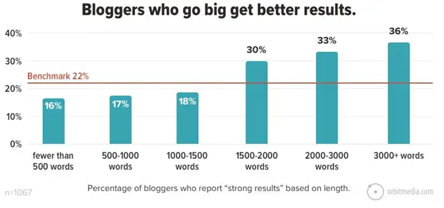 Faktanya, artikel dengan panjang 3000+ kata memiliki hasil yang lebih besar dibandingkan artikel yang lebih pendek. Dalam banyak penelitian, ada semacam hubungan antara panjang artikel dengan hasil, khusunya dalam peringkat pencarian. Dan dari tahun ke tahun menunjukkan data yang sama, bahwa artikel yang panjang memiliki kinerja yang baik.